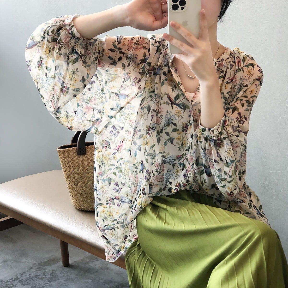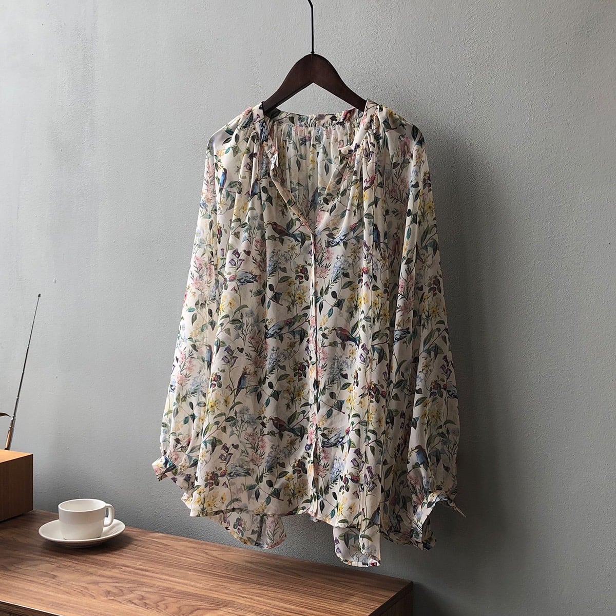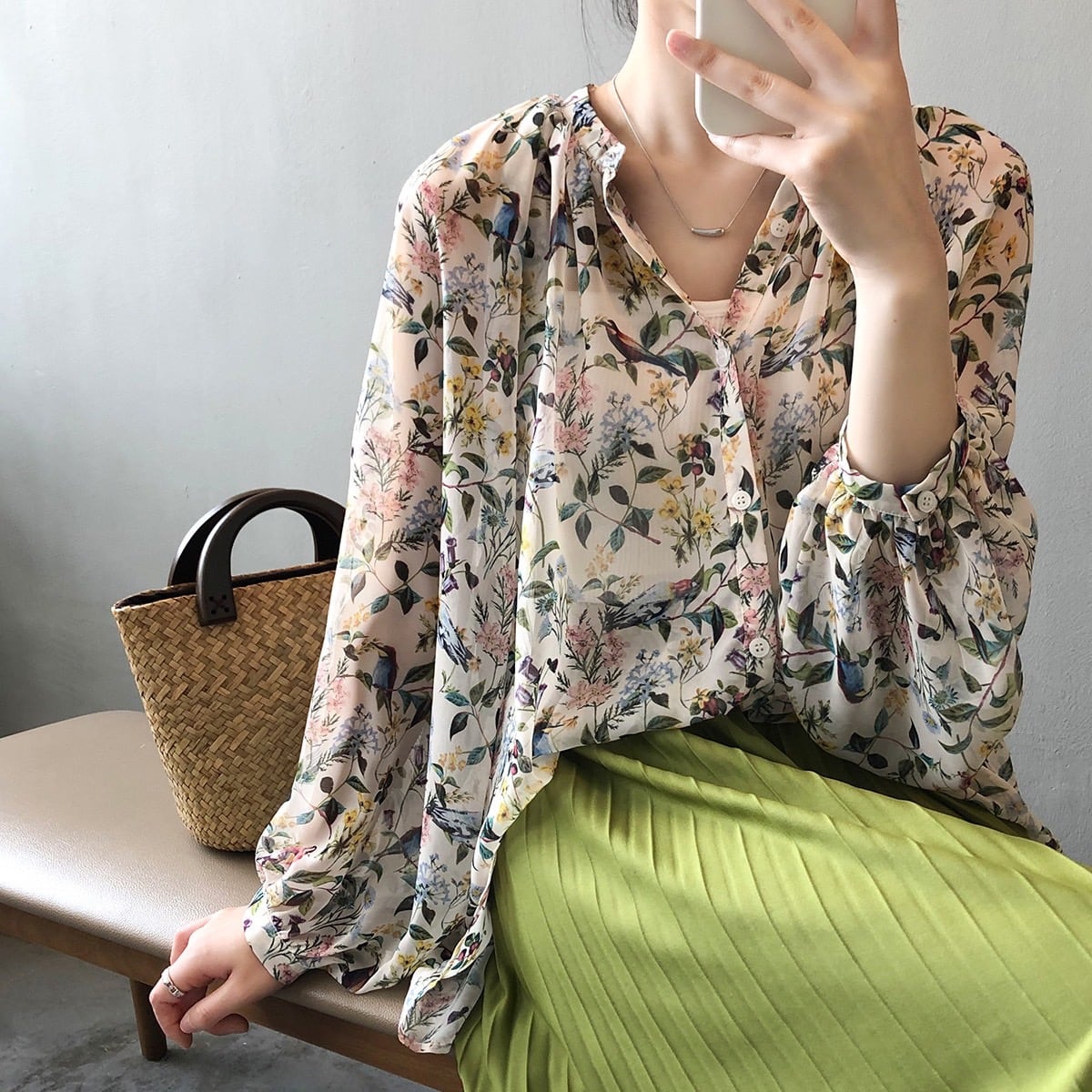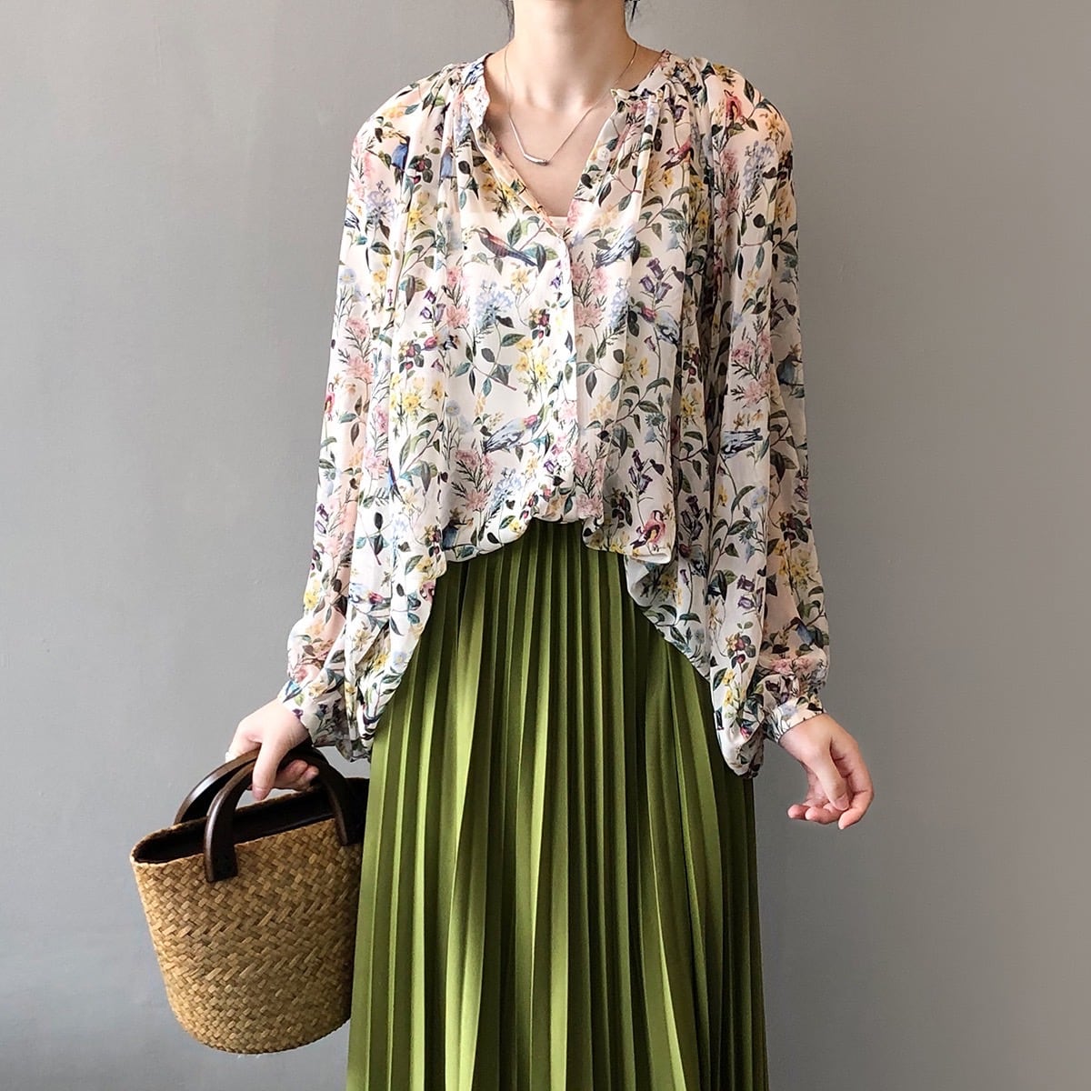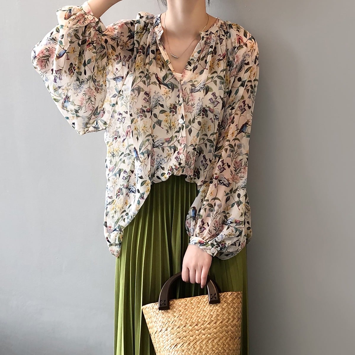 Vネックのフラワーデザインが華やかさを引き立てるシフォンブラウス。